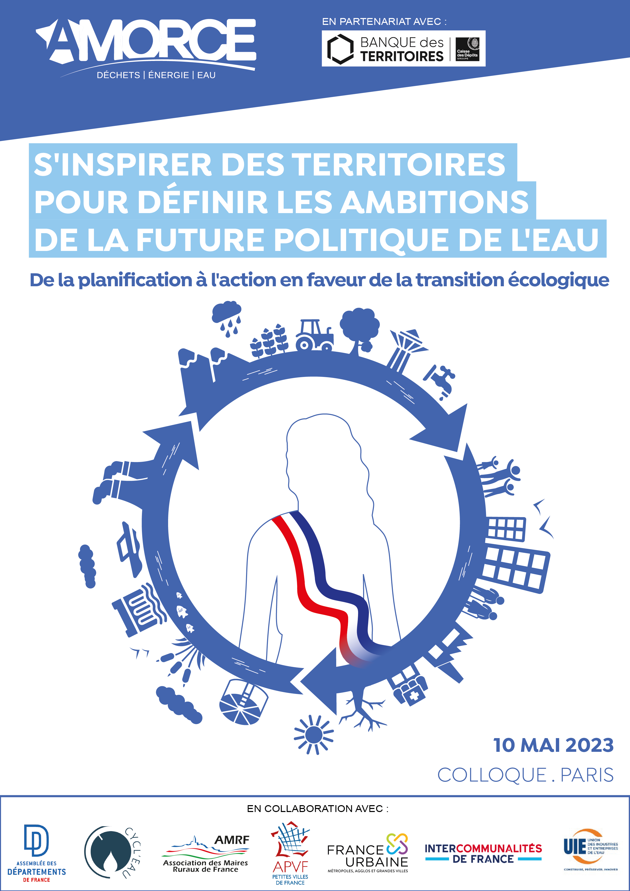 Ce colloque est organisé en partenariat avec La Banque des Territoires et en collaboration avec l'Assemblée des Départements de France, l'Association Cycl'Eau, l'Association des Maires Ruraux de France, l'Association des Petites Villes de France, France Urbaine, l'Intercommunalités de France et l'Union Nationale des Industries et Entreprises de l'Eau.